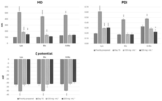 The analysis showed no statistically significant differences (p > 0.05) in MD and the PDI between Lps and Bls, indicating a comparable size distribution. In contrast, G-Bls exhibited a significantly larger MD (129.7 ± 1.2 nm, p < 0.0001) and a higher PDI value (0.33, p < 0.01) due to the physicochemical properties of gelatin. These results align with the literature for Lps and Bls, accounting for 50–150 nm and up to 200 nm, respectively; moreover, PDI ≤ 0.3 indicates a uniform size distribution, and ζ potential above ± 30 mV suggests good stability against aggregation [41,42,43]. However, studies on Lps loaded with Spirulina extracts showed an almost double MD, ranging from 226.5 to 292; a higher PDI (0.38–0.52); and comparable ζ [44,45]. Slight variations in the physicochemical parameters could be attributable to different amounts of basic ingredients, types, and loaded extracts.