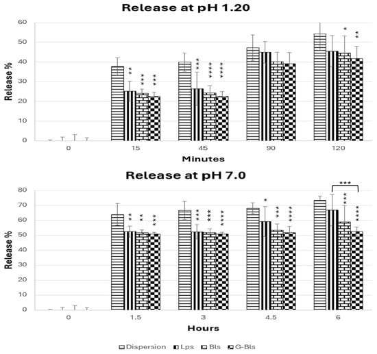 At pH 1.2, the release followed the series Lps > Bls > G-Bls and was lower than the free dispersion (after 15 min ~24% vs. ~40%) (Figure 2). After 2 h, the extract dispersion released 54.2% ± 8.3, while vesicles showed similar release profiles, ranging from 41.8% ± 6.2 in G-Bls to 45.5% ± 8.7 (mean ± SD%) in Lps (p > 0.05), due to protonation-induced charge neutralization, highlighting the protective role of vesicles in limiting early drug exposure to the harsh gastric environment [54]. At pH 7.0, the releasing trend remained the same, with Lps being less efficient in preserving the extract. After 1.5 h, almost 50% was released from the vesicles, reaching 66.9 ± 15.6 after 6 h in Lps. The free dispersion reached 73.3% ± 2.9 at 6 h, whereas Bls (58.9% ± 10.9) and G-Bls showed a lower release, accounting for 52.5% ± 3.0 (mean ± SD%), suggesting that gelatin reinforced the vesicle structure, delaying diffusion. These trends are in line with MD and PDI studies. G-Bls were larger but more homogeneous and exhibited greater stability at low pHs but swelled at neutral pHs, forming a denser matrix that restricted rapid payload diffusion, potentially extending the therapeutic window and reducing dosing frequency [55,56].