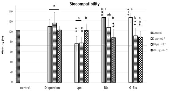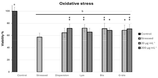 The viability of Caco-2 cells stressed with H2O2 and treated with Spirulina extract dispersion or vesicles at 20 and 200 μg·mL−1. Data are reported as mean percentages relative to untreated healthy cells (n = 8). Letters indicated statistical differences within untreated cells (control) and each group. * indicate statistical differences between H2O2 damaged cells (stressed) and cells treated with dispersion, Lps, Bls, and G-Bls (* p < 0.05, ** p < 0.01) based on ANOVA with Tukey’s post hoc test (p ˂ 0.05).