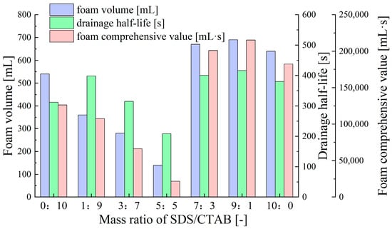 Figure 2 shows the foam volume, drainage half-life, and foam comprehensive value of foam formed by the compounded surfactant with different mass ratios of SDS (anionic surfactant) and CTAB (cationic surfactant). As shown in Figure 2, as the SDS ratio increases, the foam volume, foam half-life, and foam comprehensive value of the compounded surfactant foam first decrease and then increase. The maximum values are reached when the mass ratio of anionic to cationic surfactants is 9:1, demonstrating the best foaming performance and stability, which are superior to those of foam formed by single SDS and single CTAB surfactants. The main reason for this is that adding a small amount of cationic surfactant (CTAB) to the anionic surfactant (SDS) weakens the electrostatic repulsion between the head groups of the anionic surfactants, allowing the surfactant molecules in the adsorption layer to arrange more closely. At the same time, it retains some charge to form a double-layer structure, thereby enhancing the stability of the foam [48]. When the SDS to CTAB mass ratio is 5:5, the cationic and anionic surfactants tend to aggregate and sediment, resulting in the loss of surface activity and the poorest foam performance [49].