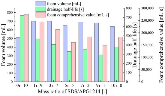 As illustrated in Figure 4, as the APG1214 (nonionic surfactant) content increases, the drainage half-life and foam comprehensive value of the SDS-APG1214 compounded surfactant foam significantly improve, while the foam volume remains relatively stable. The optimal foam comprehensive performance is achieved when the SDS/APG1214 mass ratio is 1:9. This is closely related to the properties of nonionic surfactants; nonionic surfactants can increase the viscosity of the solution, particularly near the gas–liquid interface. This results in a slower drainage rate of the foam liquid film, significantly increasing the foam half-life and enhancing foam stability [51].