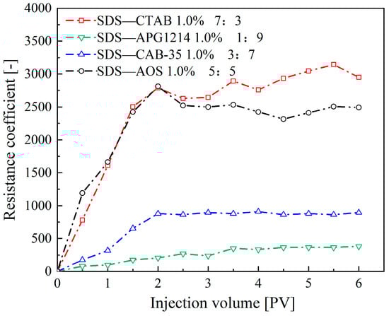 As shown in Figure 6, as more foam is injected, the resistance coefficients of foam formed by the four compounded surfactant formulations first gradually increase and then reach a dynamic steady state at approximately 2 PV of foam injection. Overall, the SDS-CTAB compounded surfactant foam exhibits the highest resistance coefficient (approximately 2950), indicating the best plugging performance, followed by SDS-AOS, SDS-CAB-35, and SDS-APG1214 in descending order of performance.