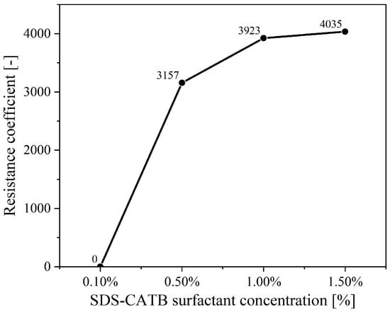 As presented in Figure 7, at a surfactant concentration of 1%, the foam formed by the compounded surfactant with a mass ratio of 9:1 (SDS/CTAB) shows the highest resistance coefficient (3923), significantly higher than that of other mass ratios. This indicates that the foam achieves optimal plugging performance at this specific mass ratio.