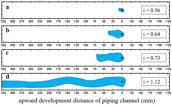 Evolution process of the piping channel with increasing hydraulic gradient i. (a) i = 0.56; (b) i = 0.64; (c) i = 0.73; (d) i = 1.12.