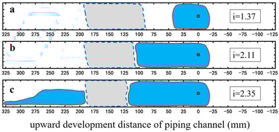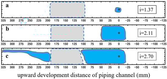 Development of piping channel in the case of SDS surfactant foam injection. (a) i = 1.37; (b) i = 2.11; (c) i = 2.35. The red lines represent the boundary of the piping channel, and the dashed lines represent the boundary of the foam area observed from the top surface.