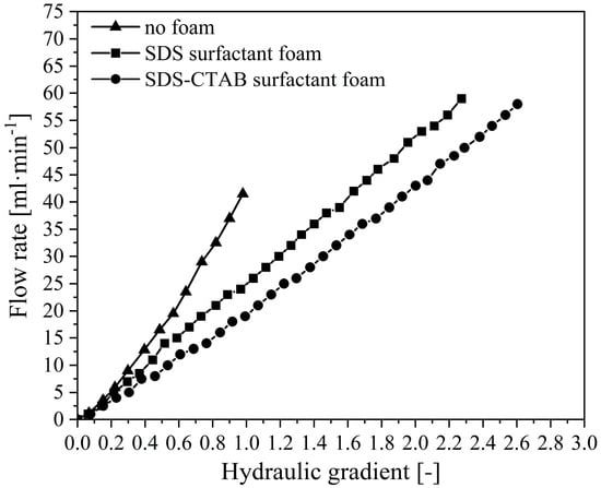 During the experiments, the water flow rate at the outlet under different hydraulic gradients is measured. As presented in Figure 13, under the no surfactant condition, the flow rate increases nonlinearly with the hydraulic gradient, which is in good accordance with previous studies. In contrast, the flow rate curves under foam-injection conditions exhibit a more linear trend. The exitance of foam clearly reduces the water flow rate; at a certain hydraulic gradient, the cases with foam injection present lower flow rates, especially the cases with the newly developed SDS-CTAB surfactant foam. This is primarily due to the formation of a uniform and continuous foam structure within the pores of the sand body. This structure effectively inhibits the loosening and migration of soil particles, thereby maintaining the relative stability of the internal pore structure. As a result, the abrupt increase in flow rate caused by sudden seepage failure, observed under the no surfactant condition, is not observed.
