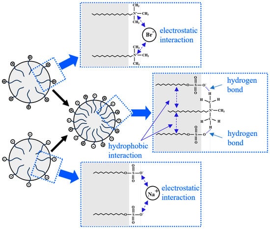 As shown in Figure 15, there is a natural electrostatic attraction between the positively charged portion of CTAB (the nitrogen ion) and the negatively charged portion of SDS (the sulfate group). This attraction between opposite charges helps stabilize the mixture of the two surfactants in aqueous solution. The bromide ion (Br−) in CTAB acts as a counterion and is partially attracted to the positively charged portion of the CTAB molecule. These ions help neutralize the positive charge of CTAB, reducing the electrostatic repulsion between CTAB molecules and making it easier for CTAB molecules to approach and interact with SDS molecules. Similarly, as an anionic surfactant, SDS contains negatively charged sulfate groups in its molecular structure. Sodium ions interact with these negatively charged groups, partially neutralizing them. By neutralizing the negative charge on the SDS molecules, sodium ions help reduce the electrostatic repulsion between SDS molecules, promoting aggregation. These electrostatic interactions effectively enhance the stability of the compounded system.