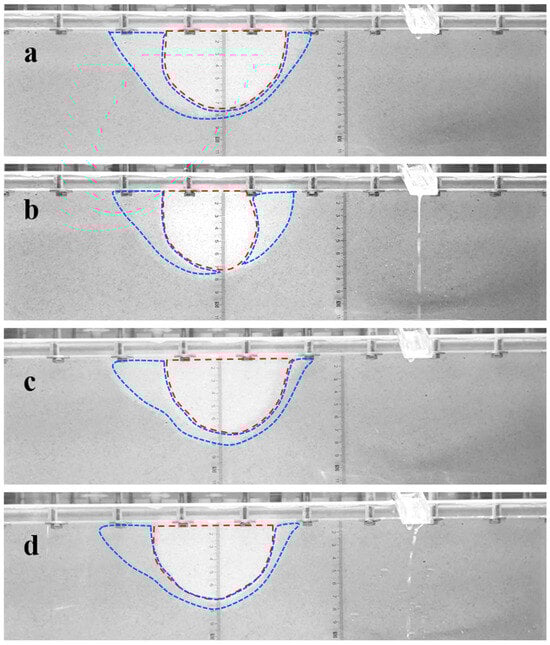 As presented in Figure 10, in the case of no surfactant injection, at low hydraulic gradients, no apparent piping channel is observed [55]. As the hydraulic gradient increases to 0.56, a distinct piping area appeared on the top of the sample (Figure 10a). Under a constant hydraulic gradient, the amount of sand loss decreases gradually until it ceases, and the development of the piping area stops accordingly. As the hydraulic gradient rises to 0.64, lateral expansion of the piping channel occurs near the outlet (Figure 10b). The piping channel extends continuously as the hydraulic gradient increases. At a hydraulic gradient of 0.73, the piping area extends about 7 cm (Figure 10c). When the hydraulic gradient reaches 1.12, the piping channel penetrates to the inlet chamber along the top surface (Figure 10d), accompanied by a large amount of sand loss.