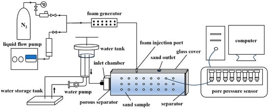 In order to investigate the capability of foam to restrain piping development, a self-developed experimental system is employed to conduct the traditional piping experiment and the foam restraining piping experiment. The system comprises five core parts: the hydraulic head control system, the foam injection system, the sandbox model, the real-time pore pressure monitoring system, and the data acquisition system (Figure 20).