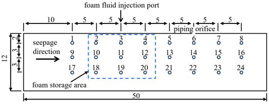 The real-time pore pressure monitoring system: This system includes three rows of pressure measuring points installed on the side of the sandbox, each row containing eight points, to monitor pore pressure at different locations in real time, and assess the impact of foam on the seepage field. The foam injection port is inserted 2 mm into the sand sample, with the top row of measuring holes positioned 5 mm below the cover. To ensure accurate representation of pore pressure distribution under various experimental conditions, pressure sensors with different measurement ranges are employed. In the piping experiments without surfactant, 24 pressure sensors with a range of 0–20 kPa are used. In the experiments of foam restraining piping development, 15 pressure sensors with a range of 0–20 kPa and 9 with a range of 0–200 kPa are used. The 0–200 kPa sensors are symmetrically arranged around the foam injection port (Figure 21).