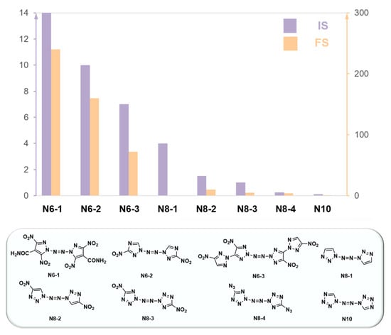 Energetic materials are regarded as a crucial part of advanced equipment which directly determines the development of civil applications and national defense. They are substances that can undergo intense oxidation–reduction reactions and release a large amount of energy under certain external stimuli. With the rapid development of energetic materials, higher requirements have been put forward for new energetic materials, including higher energy, greater security, and more environmental friendliness [1,2]. To meet these requirements, nitrogen-rich heterocycles like pyrazole, imidazole, triazole, tetrazole, and their derivatives have occupied a significant place in energetic materials in recent years [3], since they have a host of N–N and C–N bonds, exhibit high heats of formation, remarkable insensitivity, enhanced density, and environmental friendliness. Among them, long nitrogen chain heterocycles have aroused more interest due to their high heat of formation, which arises from the large energy release during the formation of N–N bonds [4]. However, materials with sufficient energy are often too sensitive to external mechanical stimuli. In contrast, many energetic materials with adequate stability do not meet the performance requirements [5]. Literature shows that long nitrogen chain compounds with both high energetic performance and good mechanical stability are rarely observed, and compounds become increasingly sensitive to external stimuli accompanied by the growth of the nitrogen–atom chain. According to the literature, the impact sensitivity of N6 is within the range of 2–14 J [6,7,8], the value of N8 is between 0.25 and 4 J [3,9,10,11], and the value of N10 is between 0 and 1 J [12].