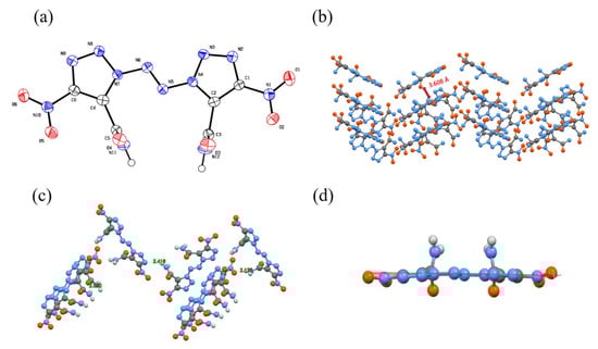 To confirm the structures of S8 and explore their HB interactions, crystals suitable for single-crystal X-ray diffraction were obtained from the slow evaporation of chloroform solution. Compound S8 crystallizes in the monoclinic space group P212121 with a calculated crystal density of 1.763 g cm−3 at 100 K (Z = 4). The crystal packing of S8 can be viewed as a face-to-face wavelike stacking with a 3.608 Å interlayer spacing, within the range of π–π interaction (<4.0 Å) [13] (Figure 2b). The packing index is 70.44%, which is a desirable packing type that contributes to low sensitivity. The bond lengths of C6-NO2 and C1-NO2 are 1.448(6) and 1.427(6) Å, respectively. There are four molecules in the S8 unit cell, and each molecule has a near-planar geometry, which can be further confirmed by the torsion angles of [N7-N8-N9-C6 = −0.1 (5)°, N5-N4-N3-N2 = 179.7 (4)°, C2-N4-N3-N2 = 0.3(6)°, N3-N2-C1-N1 = 179.8(4)°], and the torsion angles of the nitro group (C6-NO2)[O5-N10-C6-C4 = 8.6(8)°], (C1-NO2)[C2-C1-N1-O1 = −11.7(7)°].