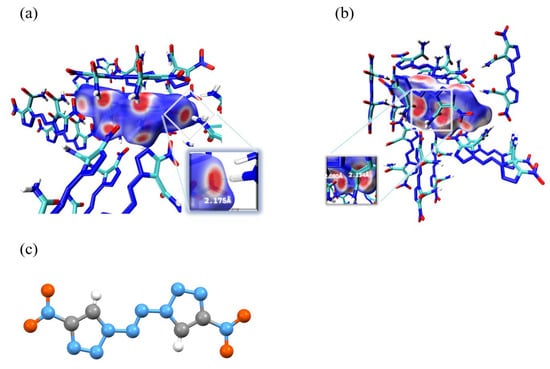 Hirshfeld surfaces for compound S8 (a,b); Given the very similar structure. In subsequent chapters, frequent comparative analysis was conducted on S8 and N8L to observe whether their performance was improved. The structure of N8L is shown in (c). (oxygen atoms (O) are represented by red spheres, nitrogen atoms (N) by blue spheres, and carbon atoms (C) by gray spheres. Hydrogen atoms (H) are depicted as small white spheres. All atoms are illustrated using the ball-and-stick model.)