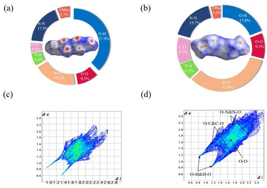Quantitative analysis of intermolecular hydrogen bonds of S8 and N8L. Hirshfeld [18] surfaces (inside) and p ie graphs of S8 (a) and N8L (b), respectively, showing the percentage contribution of the individual atomic contacts to the Hirshfeld surfaces (c,d). Highlighting N…H and O…H contacts (inside) and 2D-fingerprint plots in crystal stacking, respectively.