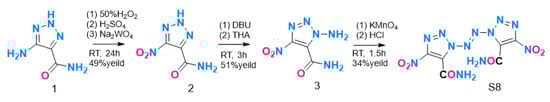 The synthetic procedures for long-chain N-rich compounds are given in Scheme 1. Compounds 1 and 2 were prepared according to the literature [16]. Further reactions involving the neutralization of compound 2 with DBU and the amination of compound 2 using freshly prepared o-p-toluenesulfonyl-hydroxylamine (THA) gave rise to compounds 3 in 51% yields. It is worth noting that the reported reactions of 1,2,3-triazole have rarely shown regioselectivity [17]. For example, the amination of diammonium 4,4′-bis(5-nitro 1,2,3-2H-triazolate) led to the formation of three isomers [17], and the amination of 4-nitro-2H-1,2,3-triazole led to the formation of two isomers [9]. However, no isomers of compound 3 could be observed in this reaction, and the selective N-amination could be rationalized from the steric effect of the amide group.