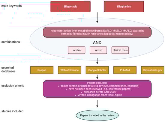 This review focuses on the detailed characterization of ellagic acid, its sources, biological functions, bioavailability and safety. A significant part of the paper is focused on the effect of EA on liver condition as well as MASLD. The paper also highlights the disadvantages associated with the poor solubility of ellagic acid in water, its short plasma half-life, and poor bioavailability after oral administration. Furthermore, it discusses several possible solutions that may help address these issues. The literature search was conducted using the PubMed, Scopus, Web of Science, Google Scholar and ClinicalTrials.gov databases. The following queries were used: ‘Ellagic acid’ or ‘Ellagitanins’ and ‘hepatoprotection’; ‘liver’; ‘metabolic syndrome’; ‘NAFLD’; ‘MASLD’; ‘MAFLD’; ‘steatosis’; ‘cirrhosis’; ‘fibrosis’; ‘insulin resistance’; ‘hepatitis’; ‘hepatotoxicity’. All of the above combinations were also supplied with the terms ‘in vitro’, ‘in vivo’ or ‘clinical trials’. Only papers published in the last twenty years (i.e., from April 2005 to April 2025) were included. To qualify for inclusion in the review, papers had to meet the following criteria: contain original data; have been independently reviewed; be written in English; and have been published after April 2005. Figure 2 shows a flowchart illustrating the data collection process for the review.