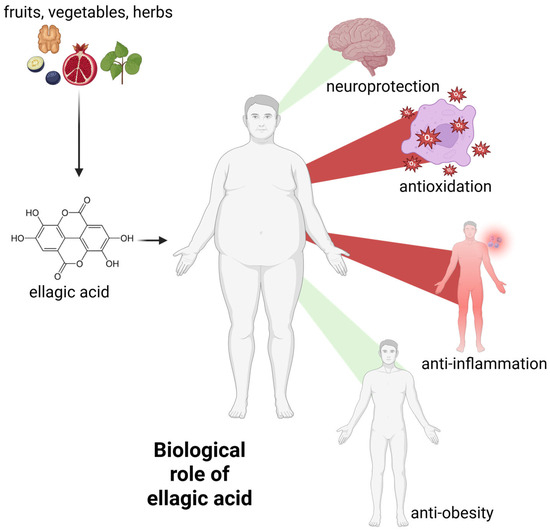 The general biological activity of ellagic acid. Green beams indicate the promotion of neuroprotection and weight loss, while red beams indicate the decrease in systemic inflammation and free radical levels. For further information, please see text below. Created with BioRender®.