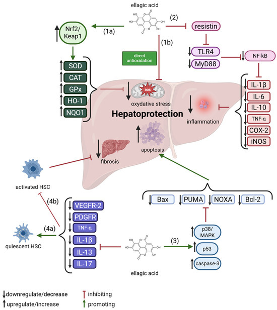 An overview of ellagic acid molecular mechanisms in hepatoprotection. 1a—indirect antioxidation, 1b—direct antioxidation, 2—anti-inflammation, 3—pro-apoptosis, 4a—promotion of quiescent of HSC, 4b—inhibition of activated HSC. For further explanations, please see text below. Abbreviations: Bcl-2—B-cell Lymphoma 2, CAT—Catalase, COX-2—Cyclooxygenase-2, GPx—Glutathione Peroxidase, HO-1—Heme Oxygenase-1, HSC—Hepatic Stellate Cell, IL—Interleukin, iNOS—Inducible Nitric Oxide Synthase, MAPK—Mitogen-Activated Protein Kinase, NF-κB—Nuclear Factor kappa-light-chain-enhancer of activated B cells, NOXA—Phorbol-12-Myristate-13-Acetate-Induced Protein 1, NQO1—NAD(P)H Quinone Dehydrogenase 1, Nrf2—Nuclear Factor Erythroid 2–Related Factor 2, PDGFR—Platelet-Derived Growth Factor Receptor, PUMA—p53 Upregulated Modulator of Apoptosis, ROS—Reactive Oxygen Species, SOD—Superoxide Dismutase, TLR4—Toll-Like Receptor 4, TNF-α—Tumor Necrosis Factor-alpha, VEGFR-2—Vascular Endothelial Growth Factor Receptor 2. Created with BioRender®.