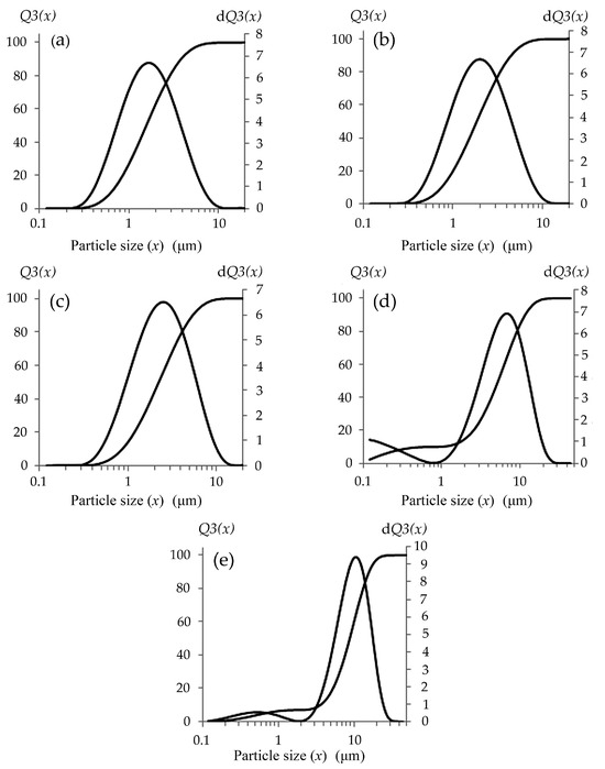 Particle size distribution in cumulative (integral) Q3(x) and differential dQ3(x) forms for narrow fractions of dispersed microspheres: (a)—NM-2; (b)—NM-2.5; (c)—NM-3; (d)—NM-6; (e)—NM-10.