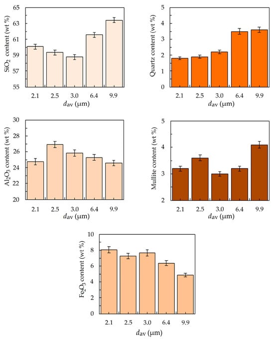 The general dependence of the chemical and phase composition of fine narrow fractions on the particle size was also established. The following tendencies were observed: with increasing dav, the content of SiO2 and quartz phase increases, whereas that of Fe2O3 decreases (Figure 3).