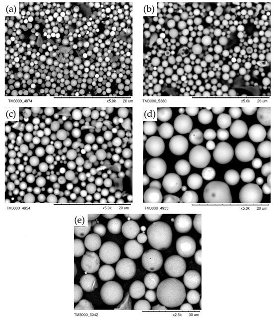 SEM images of the separated fine narrow fractions (Figure 4) show that they are represented by an absolute majority of spherically shaped particles and are homogeneous in size compared to the original ash (Figure 1). They contain well-fused spherical particles: they are small, with a smooth non-porous shell; with increasing globule size, single pores appear; the number of spheres with a porous shell in the largest fraction is about 15%; splinters are practically absent.