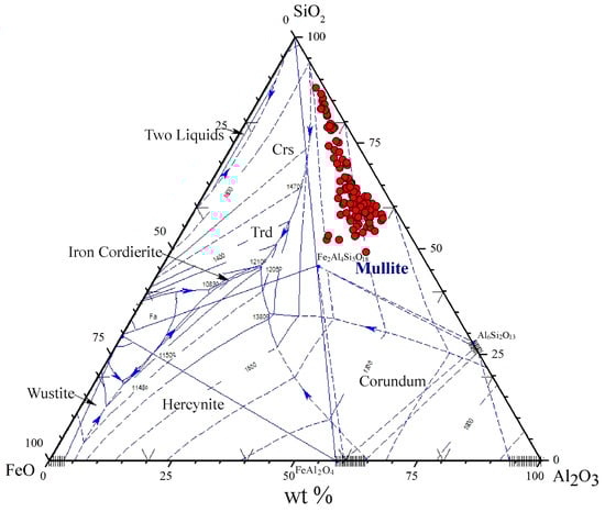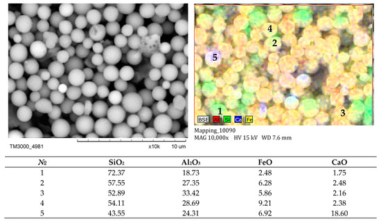 A SEM-EDS study of the chemical composition of individual microspheres from 1 to 2 μm in size, part of the PM2.5 class of particulate matter posing a specific risk to human health [20,21], was carried out. This size interval also corresponds to the maximum PM10 distribution of ash particles from the combustion of different types of coal, which is defined in the literature by the term “fine-fragmentation mode” [31,32]. SEM images in the elemental mapping mode showing the composition of individual microspheres are shown in Figure 5. The main components of individual microspheres are SiO2, Al2O3, FeO, CaO, and MgO, the sum of which exceeds 90 wt % for all microspheres. The analysis of the chemical composition of individual microspheres in the coordinates of the [SiO2–Al2O3–FeO] ternary system [33] (Figure 6) shows that they are located in the regions with primary crystallisation of the mullite phase.