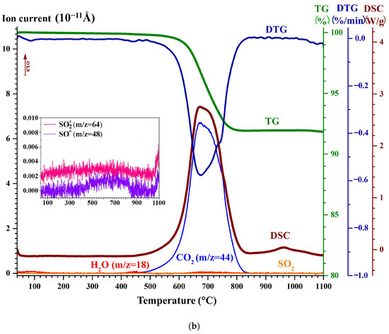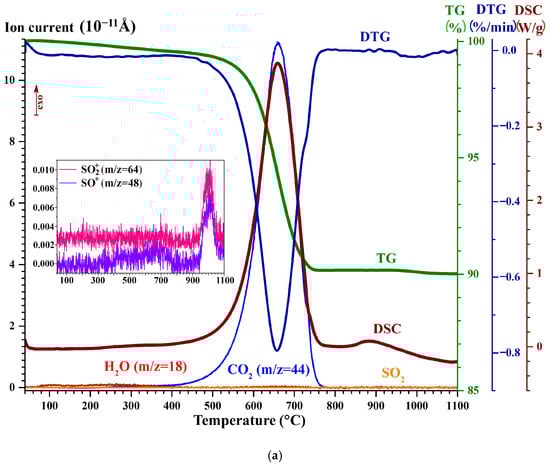 For narrow fractions of dispersed microspheres (NM-3 and NM-10), the following thermochemical transformations were observed in the temperature range of 40–1100 °C (Figure 7). The exothermic peak on the DSC curve at 659 and 672 °C is accompanied by a mass drop and CO2 emission, which is caused by the combustion process of coal char (underburning) particles. The observed mass loss in the temperature ranges of 568–742 and 602–797 °C is comparable to the loss on ignition (LOI) value determined via chemical analysis (Table 4).