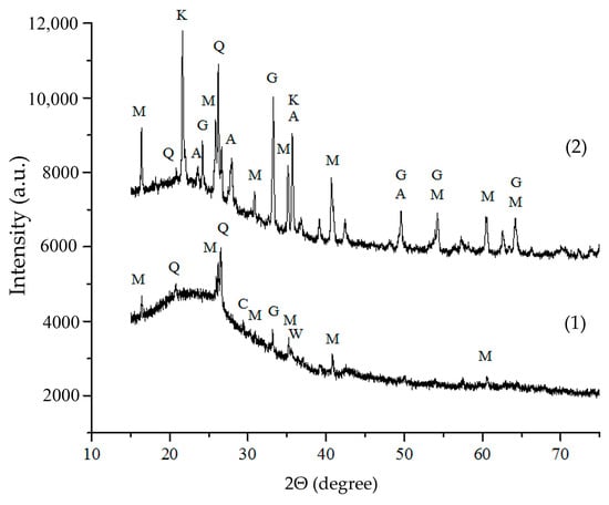 X-ray diffraction patterns of the initial narrow fraction NM-3 (1) and after heat treatment at 1100 °C NM-3/1100 (2): M—mullite (ICDD PDF 01-074-4145), Q—quartz (ICDD PDF 01-070-7344), K—cristobalite (ICDD PDF 01-075-0923), G—hematite (ICDD PDF 01-087-1164), A—anorthite (ICDD PDF 04-011-2883), C—calcite (ICDD PDF 01-086-2334), and W—ferrospinel (ICDD PDF 01-079-0416).