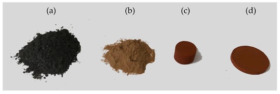 Images of the samples: (a) initial fine narrow fraction 2.5 ± 0.2 g used for the preparation of glass–ceramics; (b) fine narrow fraction after annealing at 815 °C; (c) cylindrical tablet; (d) flat membrane.