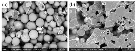 The main components of the chemical composition of the fine narrow fractions (Table 4) are silicon and aluminium oxides: the contents of SiO2 and Al2O3 vary in the range of 59–63 and 25–27 wt%, respectively, and their sum makes 85–88 wt %. The concentration of iron oxide is 5–8 wt. %, which, summed with the aluminosilicate components of the system, reaches 93–94 wt %. According to quantitative XRD analysis, the content of the amorphous glass phase is 91–94 wt % (Table 4). The high proportion of the glass phase is a consequence of the non-equilibrium nature of the pulverised coal combustion process, whereby the thermochemical transformation of mineral forms is incomplete due to high temperature gradients and short contact times [29]. Among the main crystalline phases, mullite and quartz were identified, with a content of 2–4 wt %. The mullite phase is the result of the thermochemical transformation of aluminosilicate minerals present in the original coal, while quartz forms part of its composition [29,30].