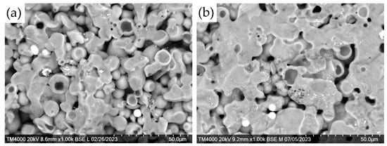 SEM images of the microstructure of glass–ceramics obtained on the basis of the narrow fraction of dispersed HM-10/AR microspheres at a sintering temperature of (a) 1100 and (b) 1150 °C.