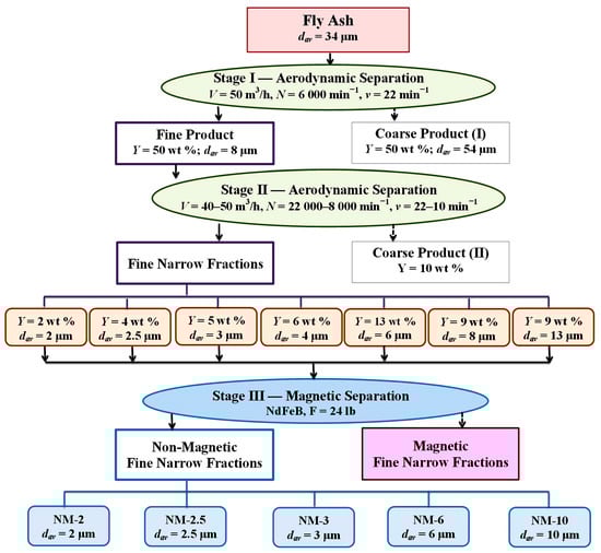 The SEM overview image and particle size distribution of the initial ash are presented in Figure 1. The bulk density, magnetic fraction content, particle size distribution characteristics, and chemical and phase compositions of the initial CFA are given in Table 2. The separation of narrow fractions of dispersed microspheres from CFA was carried out according to the technological scheme below (Scheme 1), including the stages of aerodynamic classification under different regimes and magnetic separation. As a result, non-magnetic fine fractions with a narrow particle size distribution and a certain dav (indicated by the number in the sample name) were obtained: NM-2, NM-2.5, NM-3, NM-6, and NM-10.
