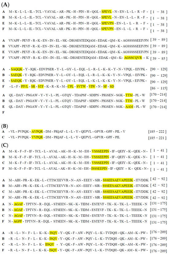 Comparison of in silico proteolysis results using pepsin, trypsin, and chymotrypsin in goat casein alleles. Only the positions where there were differences in the quantity and type of released peptides occur are shown: (A) α-S1-casein alleles, (B) β-casein alleles, (C) α-S2-casein alleles, and (D) κ-casein alleles. Allele-specific peptides are highlighted in yellow. A comparison of the complete proteolysis profile for each casein is presented in Appendix B.