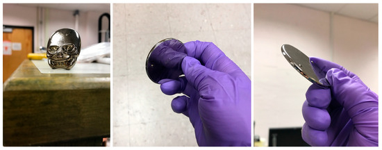 Representative casting products of MGs (with various compositions, different from the Cu-Zr-Al ternary alloys studied in the present work; shown for illustration purposes): (left) a skull with a complex shape and many fine details replicated from the mold, including roughness in some areas; (middle and right) a round disk with a 50 mm diameter and 3 mm thickness, featuring smooth and reflective surfaces.