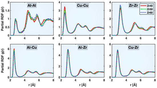 Partial radial distribution functions (RDFs) of different atomic pairs in the relaxed Zr40, Zr50, and Zr60 MGs prior to the tensile test.