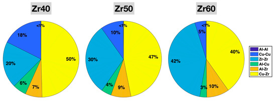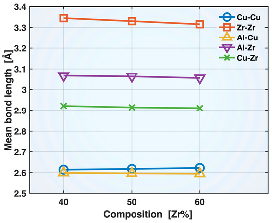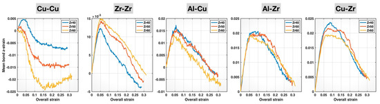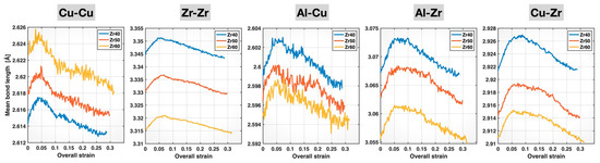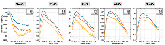 Figure 4 presents the mean bond lengths of the Cu-Cu, Zr-Zr, Al-Cu, Al-Zr, and Cu-Zr bonds in the relaxed Zr40, Zr50, and Zr60 MGs prior to the tensile test. All these bonds exhibit shortening with increasing Zr content in the alloy composition, except for Cu-Cu, which shows moderate elongation. Among the shortened bonds, Zr-Zr exhibits the greatest degree of shortening, with the mean bond length decreasing from 3.345 Å (Zr40) to 3.315 Å (Zr60), while Al-Cu displays the smallest change, from 2.599 to 2.595 Å. The shortening of the Zr-Zr, Al-Cu, Al-Zr, and Cu-Zr bonds can be partly attributed to enhanced cohesion resulting from the increased Zr content in the alloy composition. Zr has high self-cohesion energy (6.25 eV/atom) and large negative heat of mixing with Al (−44 kJ/mol) and Cu (−23 kJ/mol) [22,23]. The increased population, and hence availability, of Zr atoms may have also contributed to the shortening of the Zr-Zr, Al-Zr, and Cu-Zr bonds. On the other hand, the elongation of the Cu-Cu mean bond length may be attributed to the reduced population of Cu atoms and, simultaneously, to Cu’s relatively low self-cohesion energy (3.49 eV/atom).
