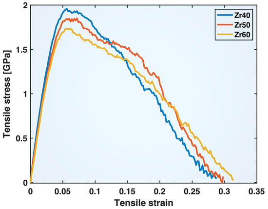 Tensile stress–strain curves of the Zr40, Zr50, and Zr60 MGs in the MD simulations.