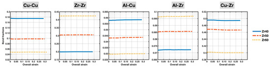Fractions of Al-Cu, Al-Zr, and Cu-Zr bonds associated with icosahedral clusters among the respective total numbers of bonds in the Zr40, Zr50, and Zr60 MGs plotted versus the overall (sample) strain.