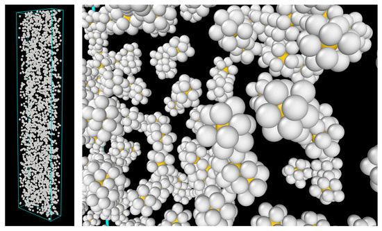 (Perspective view) ICO clusters (core and shell) in the Zr60 MG before the tensile test. (Left): overall view; (Right): close-up view. Color code: yellow—core atoms; gray—shell atoms.