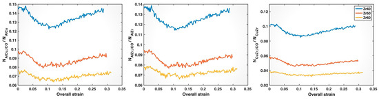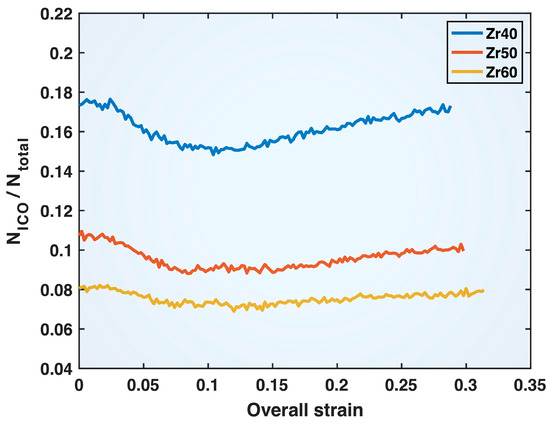 Figure 11 shows the fraction of ICO cluster atoms (both cores and shells), NICO, among the total number of atoms, Ntotal, in the Zr40, Zr50, and Zr60 MGs during deformation as a function of the overall (sample) strain. It is evident that the ICO atomic fraction decreases with increasing Zr content in the alloy composition, a trend that can be expected to contribute to the overall weakening of the material. Additionally, it can be seen from Figure 11 that, in the elastic regime of deformation (up to ~0.07 sample strain) of all three MGs, the ICO atomic fraction drops noticeably. This alludes to the role of ICO clusters in resisting deformation and contributing to the strength of MGs.