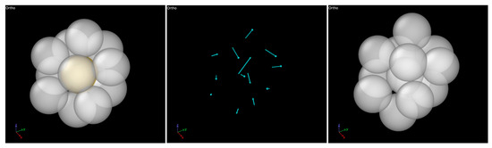 MD snapshots showing the transformation of an ICO cluster (left) into a non-ICO cluster (right) due to deformation (over a 0.2% sample strain increment), with the displacement vectors of the atoms shown in the (middle).