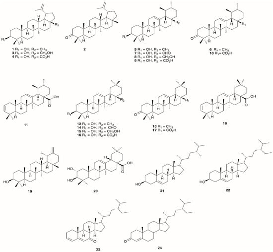 Mediterranean heath species, and heaths generally, are a rich source of triterpenes with the pentacyclic triterpenes by far the most dominant class, especially those based on the ursane, oleanane and lupane scaffolds together with modest amounts of sterols and steroidal ketones. In-depth qualitative and quantitative analysis of the content of these constituents has been carried out on E. arborea by GC-MS [12] and to a lesser extent on E. manipuliflora [110], E. andevalensis [111] and E. multiflora [112]. In E. arborea, ursolic acid (14,889.49 μg/g) was a dominant triterpenoid in the profile followed by oleanolic acid (6022.89 μg/g), and while not separated by GC-MS, a mixture of lupeol/α-amyrin totaled 23,809.86 μg/g suggesting that these neutral triterpenoids may in fact be present in higher amounts [12]. A modest level of β-amyrin (2396.95 μg/g) was also present. The most dominant sterols were sitosterol and campesterol, 846.15 μg/g and 304.60 μg/g, respectively. Sitostenone and tremulone, 50.49 μg/g and 82.73 μg/g, respectively, were identified as the principal steroid ketones [12]. Ursolic acid has also been isolated from the aerial parts of E. manipuliflora [110] and E. andevalensis while α-amyrin has also been documented from E. andevalensis [111] and lupenone identified by HPLC in the leaves of E. multiflora [112] (Table 4), (Figure 3).