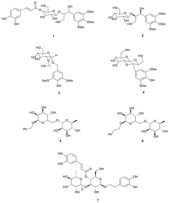 In Table 6, Figure 5, the phenylpropanoid glucoside series identified in E. arborea is documented where the aglycone moiety is linked via an ether to the sugar moiety; if there are two aglycones, an ester linkage may also be employed [119].