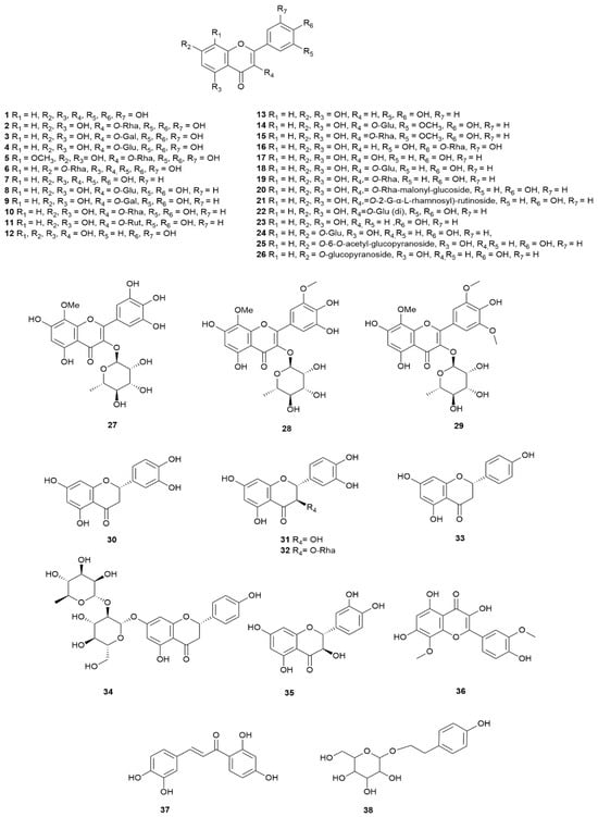 Across all Mediterranean heath species, the most widely studied class of secondary metabolites are the flavonoids in both aglycone and glycoside forms. In many cases the exact mono/disaccharide has been identified, but the literature is full of examples where the sugar moiety has not been identified and the constituents are ambiguously specified as pentosides or hexosides, thus preventing true correlation of the active principle(s) with biological data. Of the flavonoid forms present, myricetin, quercetin, kaempferol and apigenin are the most common with some species also containing isorhamnetin and naringenin [9,16,18,19,85,87,113,115,117,120]. Both qualitative and quantitative analyses of the flavonoids in E. arborea, E. scoparia, E. multiflora, E. australis and E. manipuliflora have been documented [9,16,18,19,85,87,113,115,117,120]. While over 70 phenolic type compounds in E. arborea have been identified ranging from phenolic acids/esters to flavonoids in both free and glycoside form, the principal flavonoids identified were quercetin (598.72 mg/kg), quercetin 3-O-glucoside (633.41 mg/kg), kaempferol 3-O-glucoside (475.95 mg/kg), epicatechin (588.00 mg/kg) and catechin (27.43 mg/kg) when an accelerated solvent extraction procedure was performed on its dried powdered leaves [9]. A limited number of other flavonoids in free form have been identified and quantified including taxifolin, eriodictyol, luteolin and kaempferol [9]. Interestingly, the content of these constituents and that of the related glycoside forms varied considerably depending on the extraction method used ranging from microwave-assisted, ultrasound-assisted, and solvent-based to Soxhlet extraction methods. Of these, the ultrasound-assisted method proved to be the least efficient with the optimal method being accelerated solvent extraction [9]. LC-MS/MS analysis of a methanol extract of E. multiflora leaves harvested in Tunisia found that quercetin-3-O-glucoside and kaempferol-3-O-glucoside in almost equal proportions collectively constituted 60%, by area percentage, of the polyphenols present in the extract [117]. Methyl-dihydro-quercetin hexoside, myricetin and quercetin-3-O-rutinoside represented the other significant flavonoids present [117]. Overall, the total flavonoid content is significantly lower relative to E. arborea and E. scoparia. By far the most dominant flavonoid type in E. scoparia is myricetin which is present as myricetin-O-hexoside (184.38 mg/kg) and myricetin-O-rhamnoside (153.65 mg/kg) [87]. Several flavonoid glycosides have been identified, but not quantified, in E. australis. These include gossypetin glycoside, myricetin 3-O-glucoside, myricetin 3-O-rhamnoside, quercetin 3-O-rhamnoside, kaempferol 3-O-rhamnoside, quercetin acetyl-rhamnoside, quercetin 3-O-(6″-rhamnosyl) glucoside (rutin), quercetin 3-O-glucoside, isorhamnetin 3-O-glucoside, kaempferol 3-O-glucoside (astragalin) and quercetin 3-O-rhamnoside [18,115,121] (Table 7), (Figure 6).