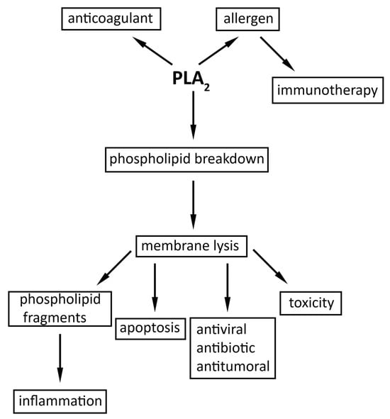 Another role of PLA2 is the production of inflammatory mediators [17,126,127]. The fatty acid and the lysolecithin resulting from the enzymatic activity of hvPLA2 can further serve as precursors for generating eicosanoids [126,128], platelet-activating factor, and lysophosphatidic acid, which in turn modulate many cellular processes [129]. Farooqui et al. [130] reviewed the multiple biological effects of all these molecules. Studies on mammalian sPLA2 revealed that it indirectly triggers the inflammatory process through the release of fatty acids. This, in turn, leads to increased vascular permeability, hemodynamic alterations and, further, organ injury [131]. Wery et al. [110] proved the presence of sPLA2 in various inflammatory exudates, in platelets and in the synovial fluid of patients suffering from rheumatoid arthritis. Furthermore, it induced tracheal inflammation and mucus production in an in vivo model of asthma [132]. Additionally, PLA2 was observed to also behave as an acute phase reactant, with clinical studies on post-surgical patients showing an immediate increase in the concentration of the enzyme, with a maximum in the second day post-operative [133].