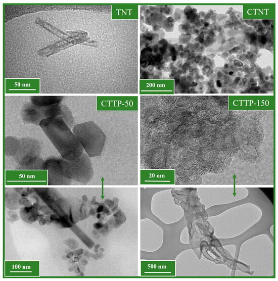 Figure 1 shows conventional TEM images of pristine TNT, CTNT, and CTTP samples (CTTP-50 and CTTP-150) at different magnifications. These images provide a valuable insight into the effects of thermal treatment in an inert atmosphere on the size, shape, and occurrence of the TNTs, while also illustrating the influence of ANI content on the morphology of the resulting composites.