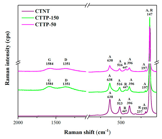 Raman spectroscopy was used to investigate the structural changes in the nanocomposites and pristine TNT after thermal treatment at 650 °C in an inert atmosphere and to check whether the PANI part in the composites was completely carbonized (Figure 2). The Raman spectrum of annealed pristine TiO2-NTs (CTNT) shows a strong vibrational band at 147 cm−1, which can be associated with both the anatase and rutile crystal phases, bands at 195, 396, 513, and 638 cm−1, which are assigned exclusively to the anatase phase, and two weak bands at 237 and 447 cm−1, which are assigned to the rutile phase [12,13]. However, considering the significantly higher intensity of the anatase bands compared to the rutile bands and the absence of other characteristic rutile bands (the strongest rutile band at about 615 cm−1 is most likely masked by the much stronger anatase band at 638 cm−1), it can be concluded that carbonized pure TiO2 NTs (CTNT) are predominantly in anatase form.