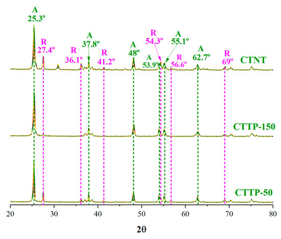 Figure 4 shows that the intensity ratio of the anatase (101) to rutile (110) peaks is much higher for CTTP-150 than for CTTP-50, indicating a stronger stabilization of the anatase phase when a lower initial concentration of polyaniline was used. This is also confirmed by the calculations shown in Table 1. It is noted that the percentage of the rutile phase in CTTP-150 (10.03%) is more than twice as low as its content in CTTP-50 (22.65%). This indicates that the single- or double-layer carbonized polyaniline structure (in CTTP-150) acts as a better protective agent during the carbonization process, by reducing the conversion of anatase to rutile, than the multilayer carbonaceous surface content (in CTTP-50). Similar results were observed in our previous study [13].