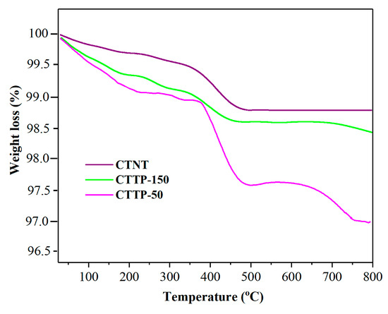 Regarding the influence of TiO2 on the thermal stability of the synthesized CTTP nanocomposites, it can be observed (Figure 5) that the complete thermal decomposition of CTTP-150 starts at around 460 °C. In contrast, the complete decomposition of the CTTP-50 sample starts at about 500 °C, which confirms the positive effect of TiO2 on the thermal stability of the synthesized nanocomposites. Similar results have also been reported in the literature [44,45,46].