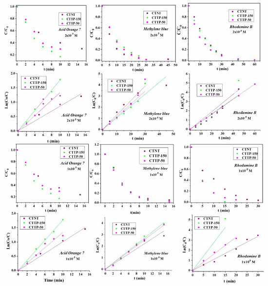 Photocatalytic activity of different concentrations (1 × 10−5 and 2 × 10−5 M) of AO7, MB, and RB in the presence of neat CTNT and CTTP nanocomposite samples (CTTP-150 and CTTP-50). All experiments were performed after 30 min dark equilibration to eliminate the contribution of initial dye adsorption; degradation data shown reflect only the photocatalytic effect under visible-light irradiation.